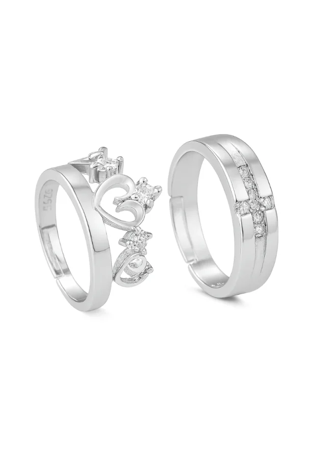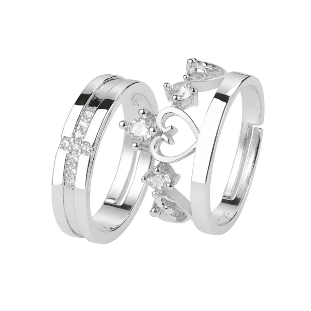 Una de las alianzas presenta un diseño minimalista con incrustaciones de circonitas blancas, mientras que la otra incorpora un corazón central rodeado de pequeños destellos, evocando la fusión perfecta entre amor y armonía.