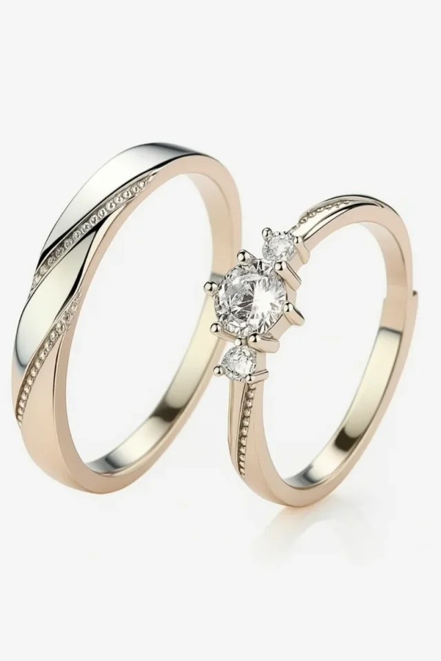 El modelo femenino destaca por un brillante central engastado acompañado de dos circonitas laterales que aportan luz y sofisticación. El modelo masculino presenta un diseño entrelazado con un acabado fluido y detalles de circonitas laterales que realzan su carácter premium.