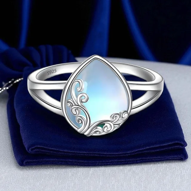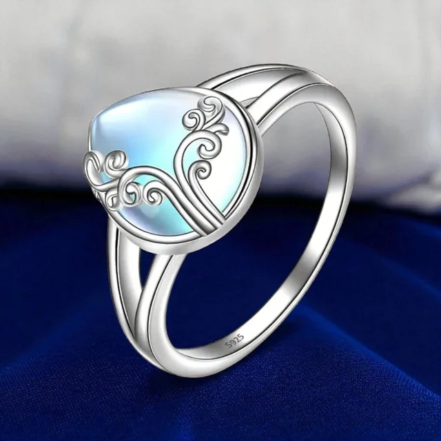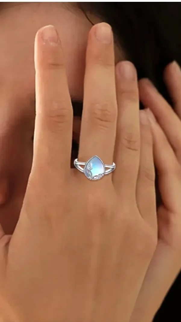 Anillo de plata de ley con un elegante diseño en forma de corazón, engastado con una piedra lunar azul en forma de gota que brilla intensamente. Disponible en tallas 7, 8 y 9, es una joya delicada y sofisticada, perfecta para regalar o lucir en ocasiones especiales.