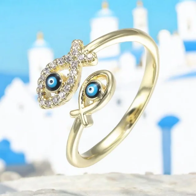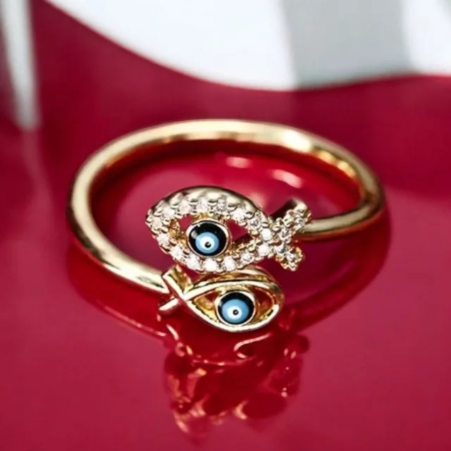 Precioso anillo de estilo minimalista con dos peces que incorporan el símbolo del mal de ojo. Es de color dorado y azul, y tiene un diseño elegante y delicado.
