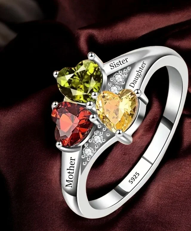 Anillo de plata con tres corazones de piedras multicolores.