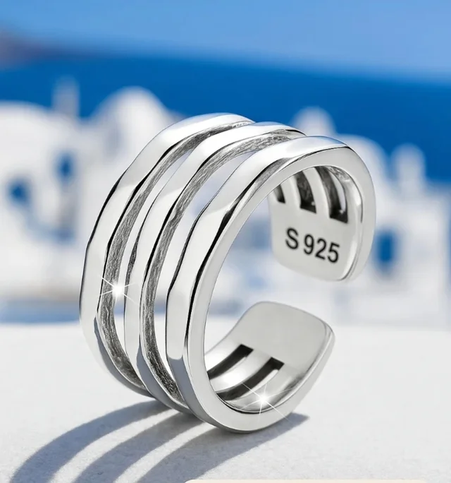 Precioso anillo de tres bandas entrelazadas. Es de plata de ley 925, como indica su marca. Luce elegante y sofisticado, ideal para ocasiones especiales o para dar un toque refinado a tu estilo diario.