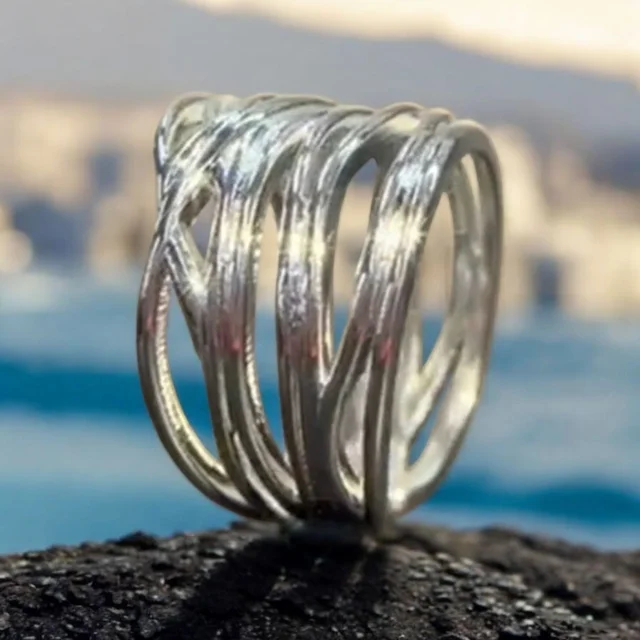 Precioso anillo de plata de diseño trenzado. Es una pieza elegante y con un estilo único.