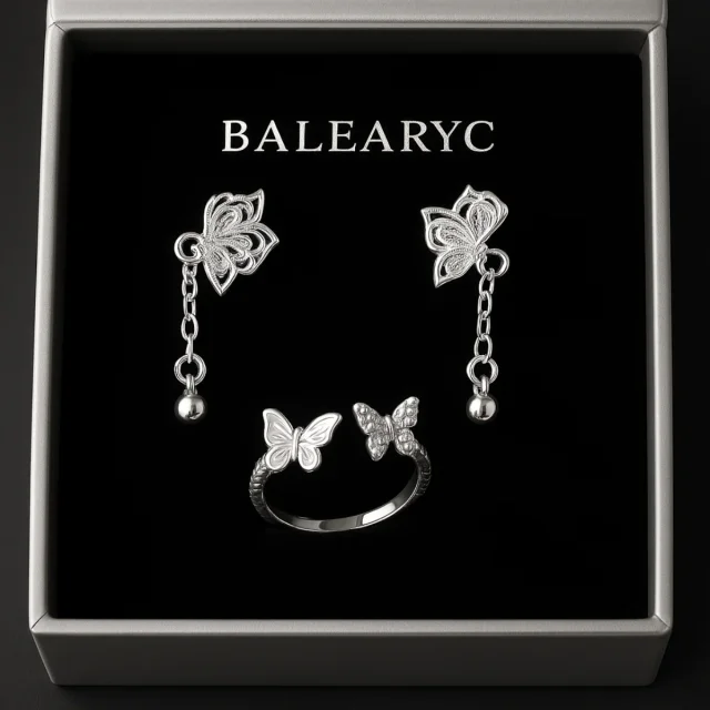 Conjunto de joyas de plata 925 inspirado en la delicadeza de las mariposas. Incluye un anillo ajustable con doble mariposa y unos pendientes con diseño calado y cadenas finas que aportan movimiento y elegancia.